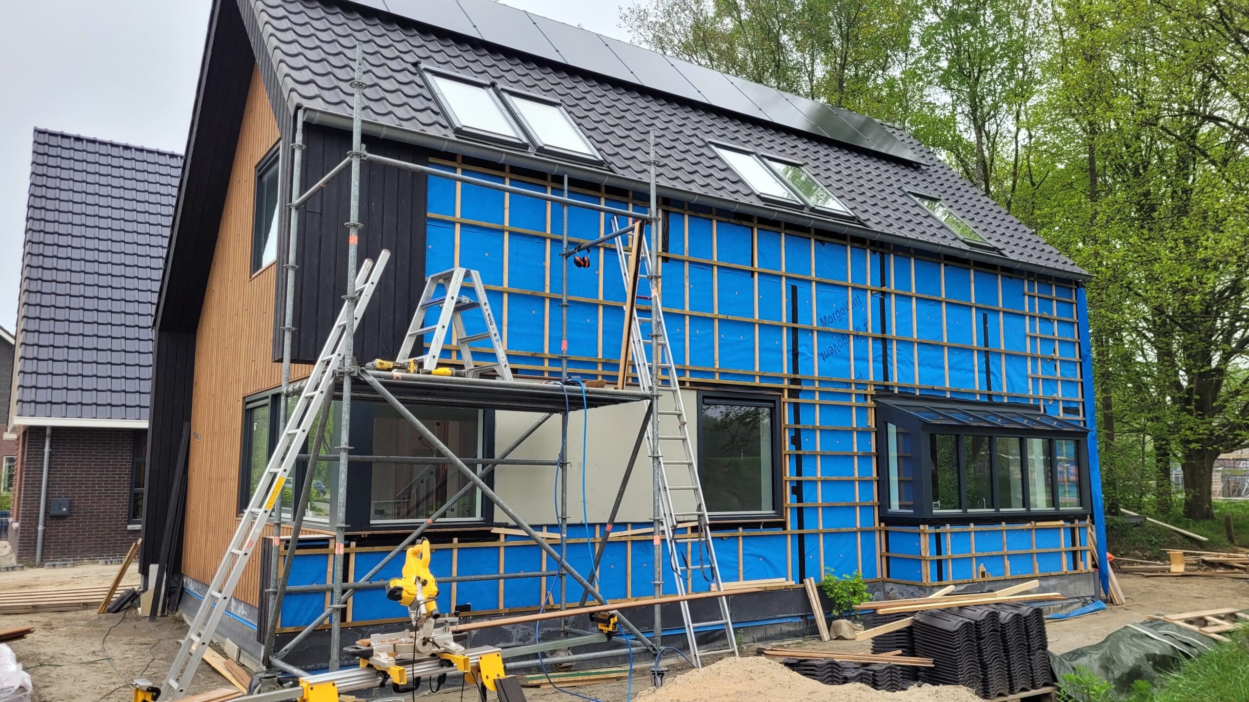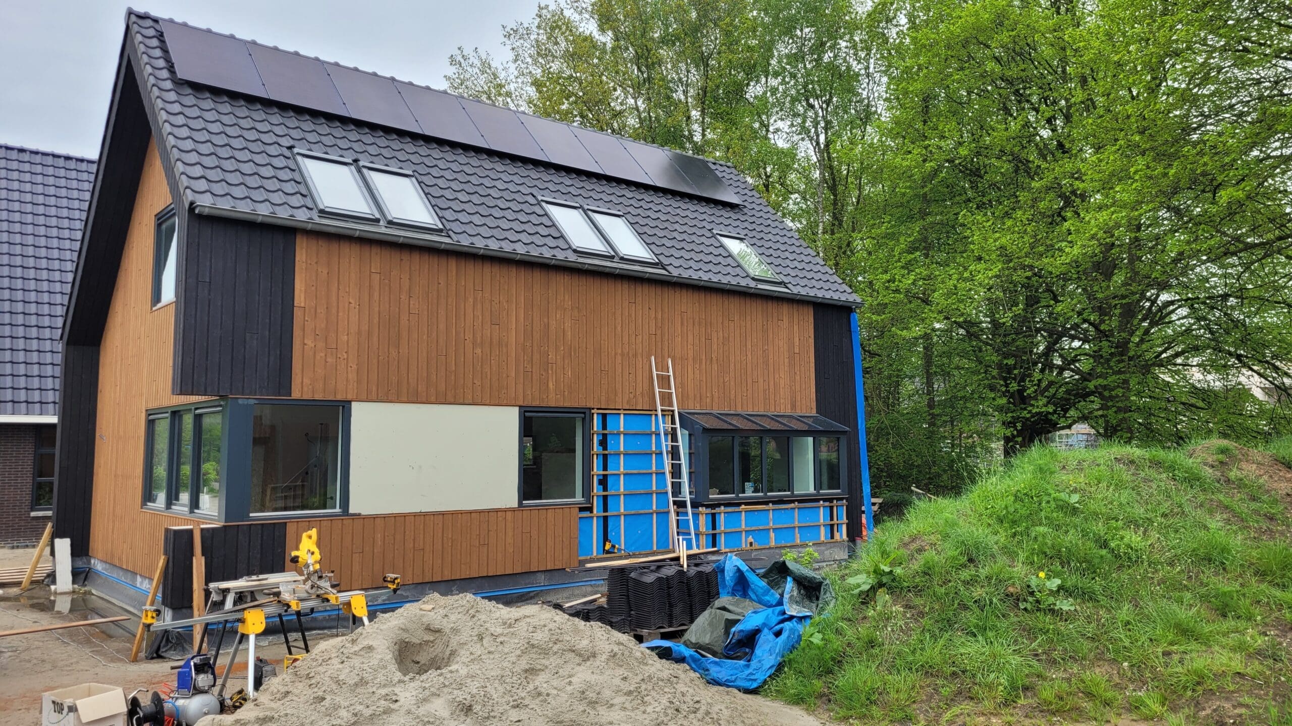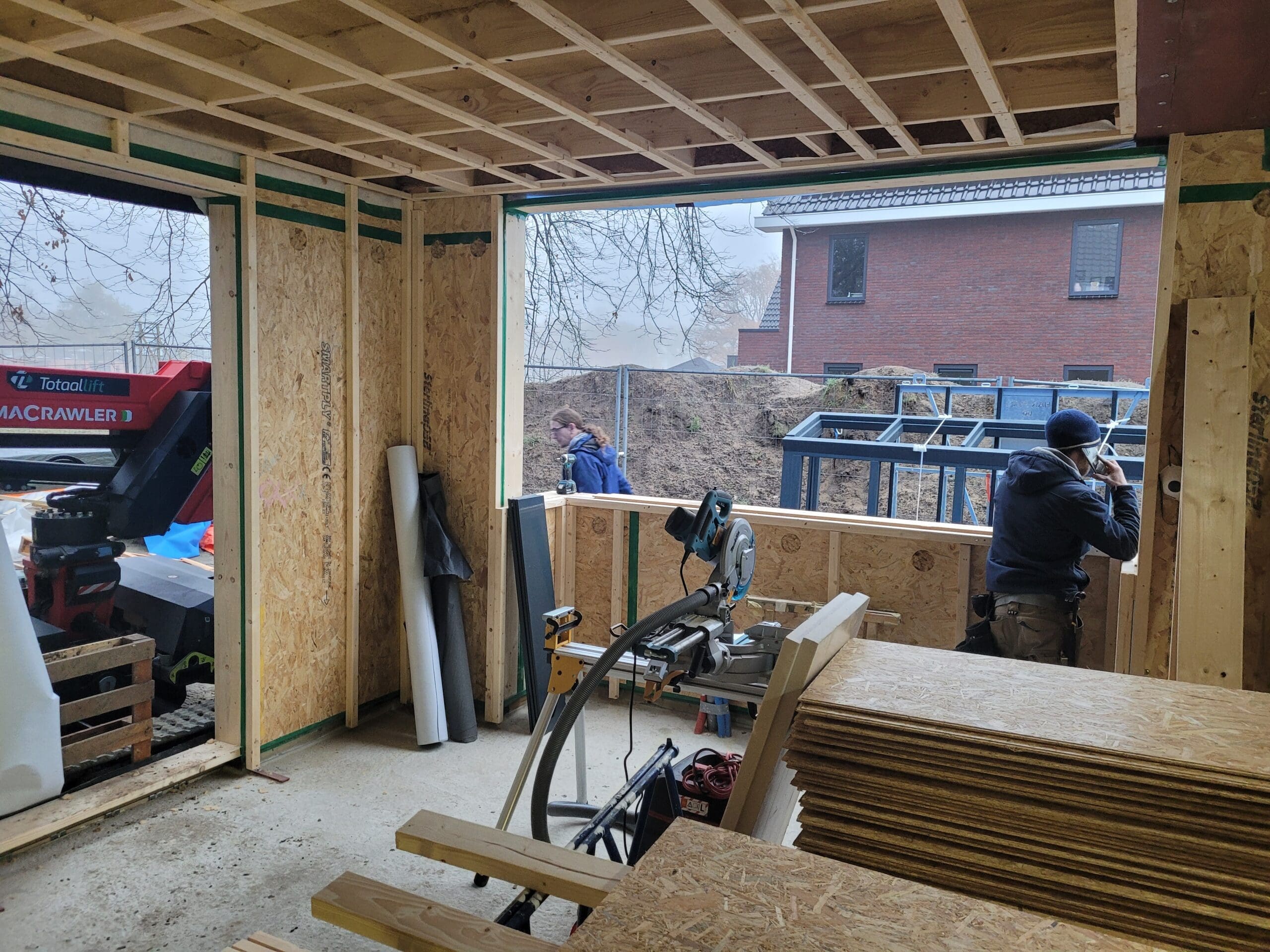 Het team ruimt steeds het afval op, een nette werkplaats en ze zijn fantastisch op elkaar ingespeeld. Wat hebben we hier van genoten!  Gewoon een hele fijne club mensen bij elkaar die aan alle kanten weten wat ze doen. Toen het huis (casco) stond, begon het voor ons - en hebben we flink de handen uit de mouwen gestoken.  We hebben zelf de afbouw van de woning gedaan. Hier en daar met behulp van een specialist en timmerman (alleen al om de professionele apparatuur een aanrader!), een mooie samenwerking.