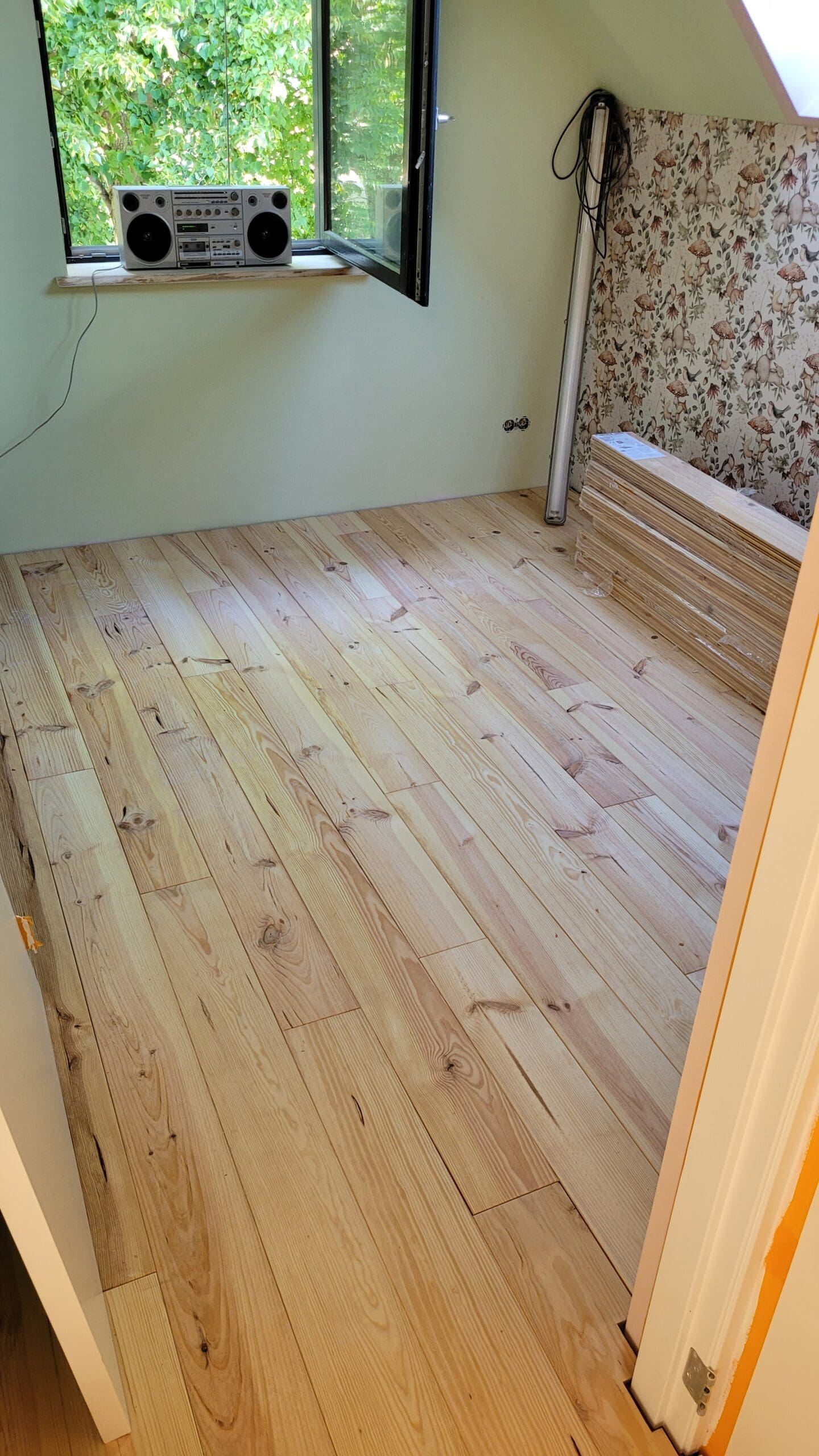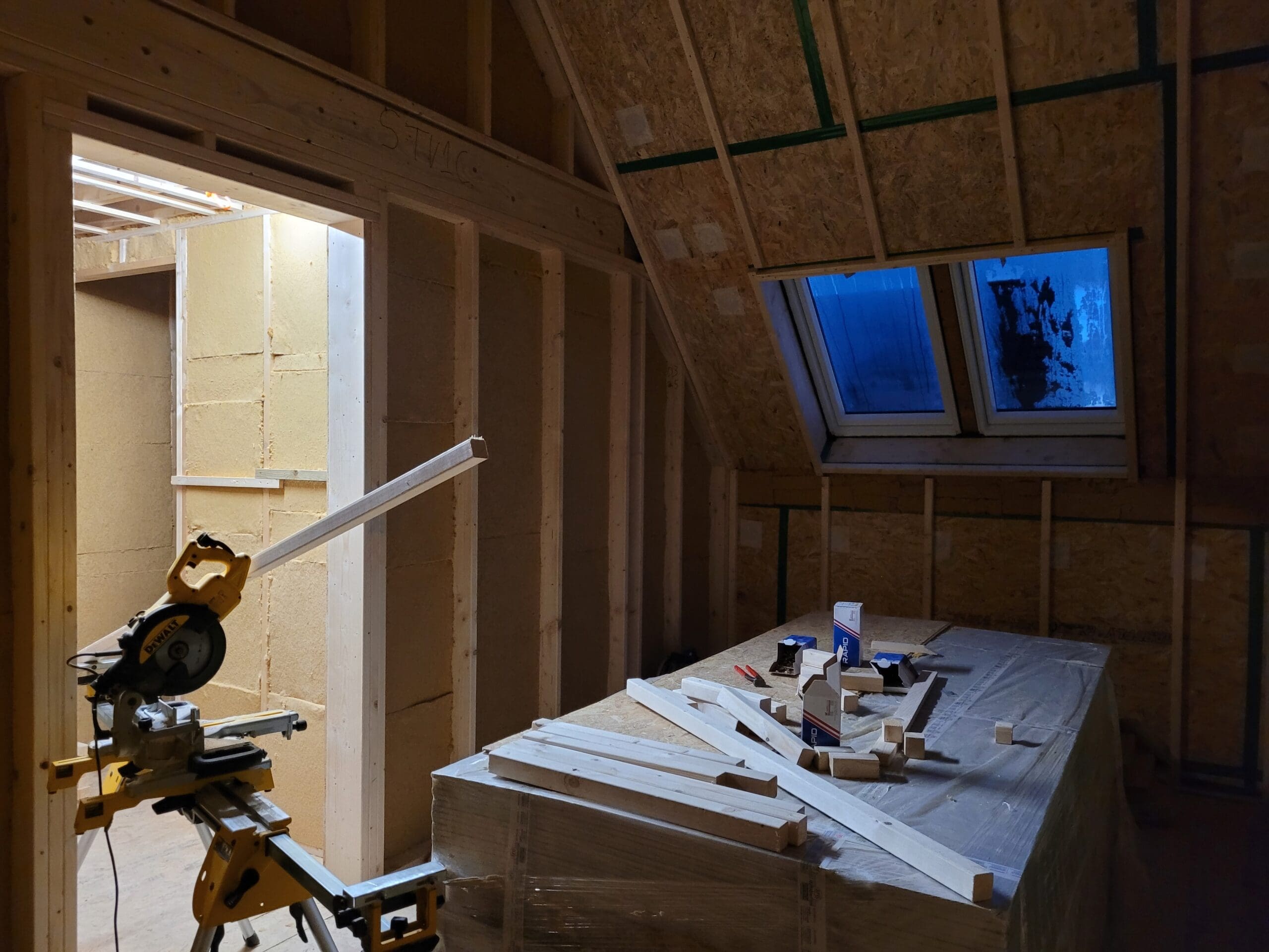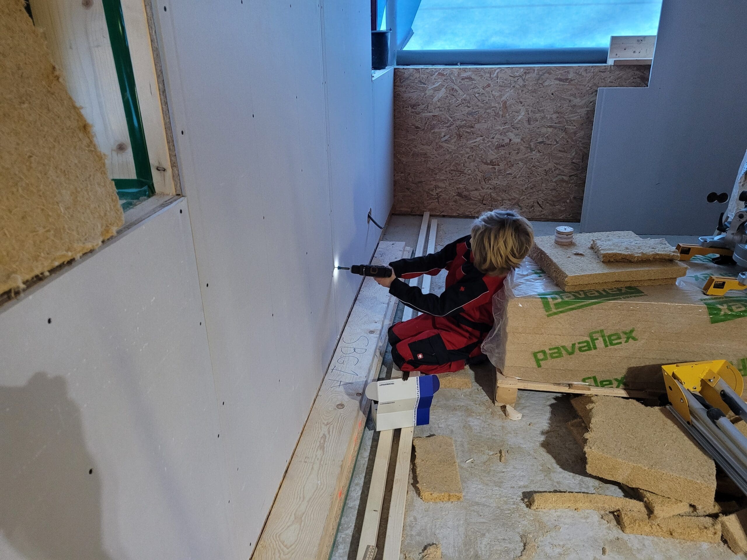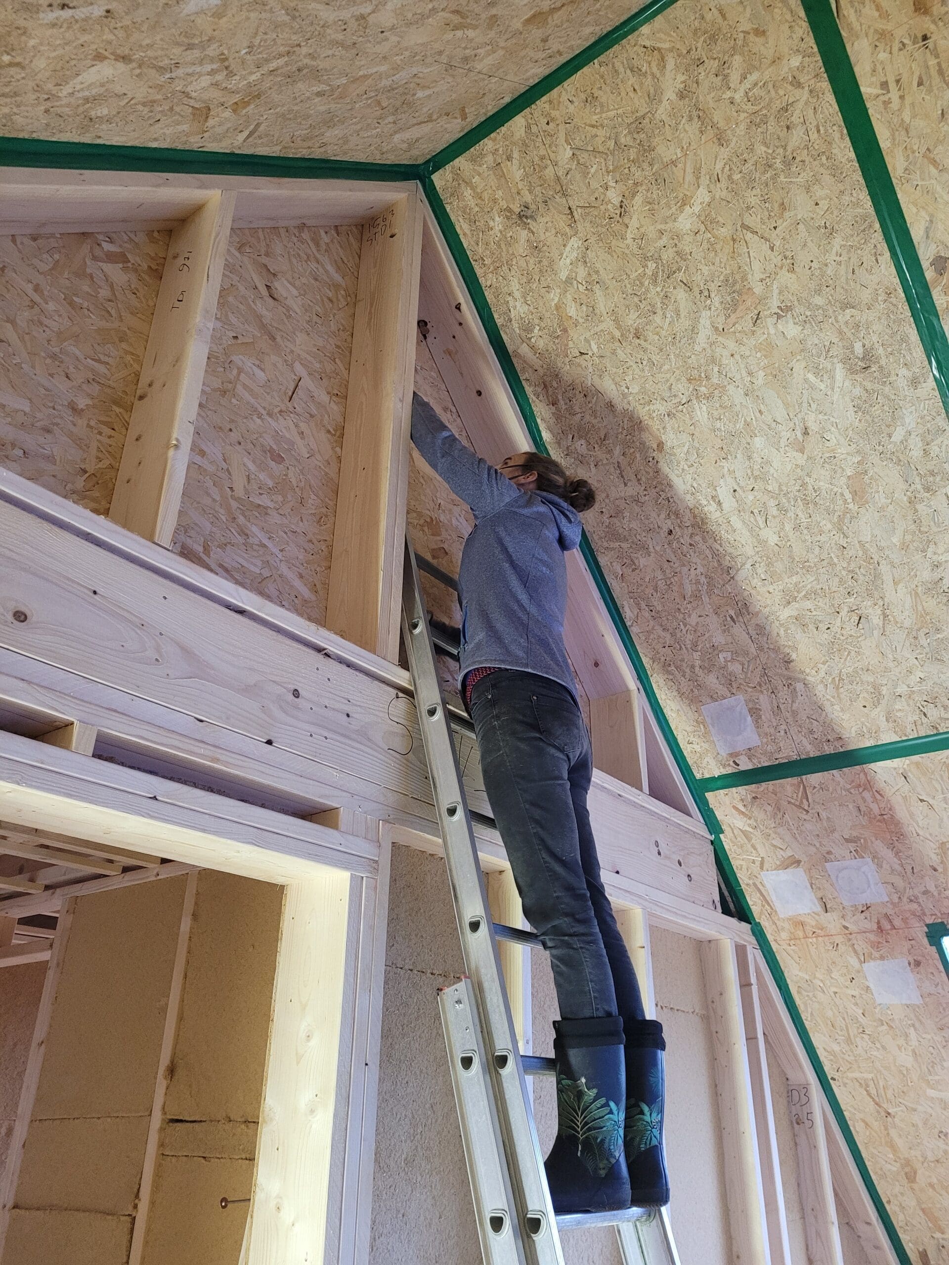 Ieder moment dat we konden, zijn we gaan bouwen en klussen. Aan de binnenkant zitten kilo's en kilo's aan houtvezelisolatie (zelf snijden en aanbrengen), een logisch netwerk van elektra en water aangebracht, gipsplaten aangebracht, aan de buitenzijde zitten véél planken met nog véél meer spijkertjes (zelf zagen en aanbrengen) en ga zo maar door. Het is veel, maar een mooi proces.